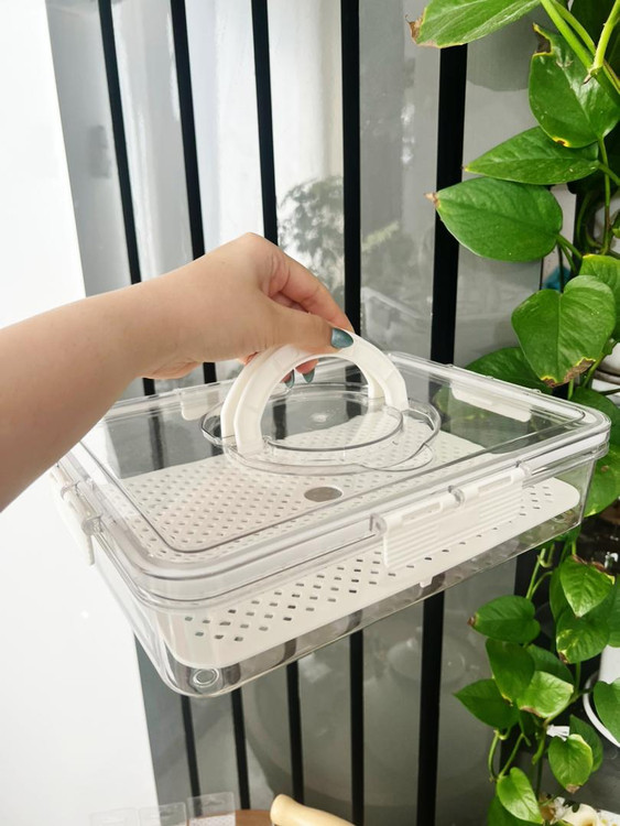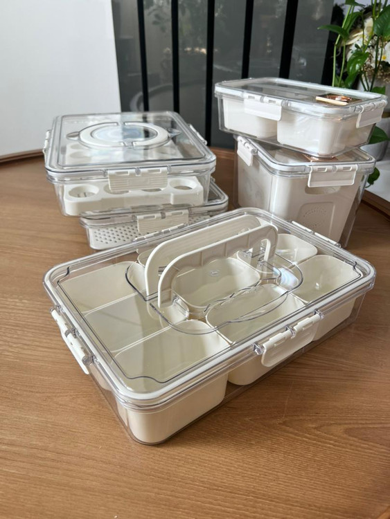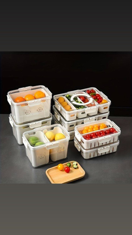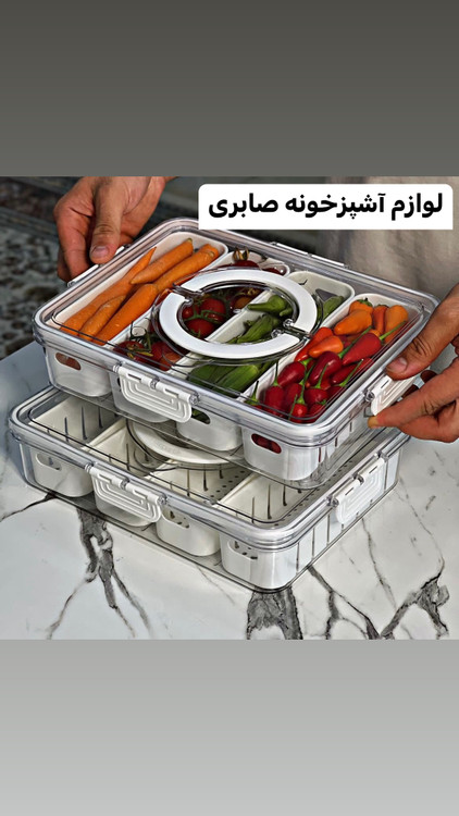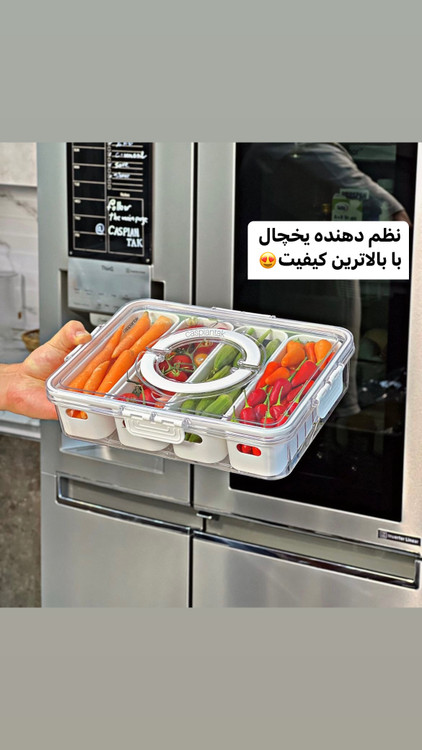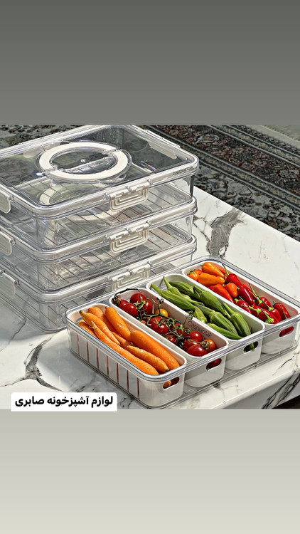 بروزترین ظرف نگهدارنده و نظم دهنده يخچالي خارجي بسیار پرکاربرد مناسب برای نگهداری انواع میوه ها و سبزیجات دارای آبکش و درب محکم جنس پلاستیک درجه یک PET (قابل استفاده از _۲۰ درجه سانتیگراد تا ۶۰ درجه سانتیگراد) ___ موجود در چهار سایز 1⃣باکس یخچال و تنقلات ۴ خانه ابعاد 2129 cm ارتفاع 6,5 cm ( 2⃣باکس یخچال و تنقلات ۲ خانه ابعاد 3022 cm ارتفاع 14 cm ( 3⃣ باکس یخچال و تنقلات ۴خانه ابعاد 3022 cm ارتفاع 14 cm (630) 4⃣باکس یخچال و تنقلات ۲ خانه ابعاد 1523 cm ارتفاع 6,5 cm (530)