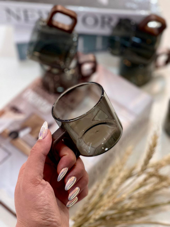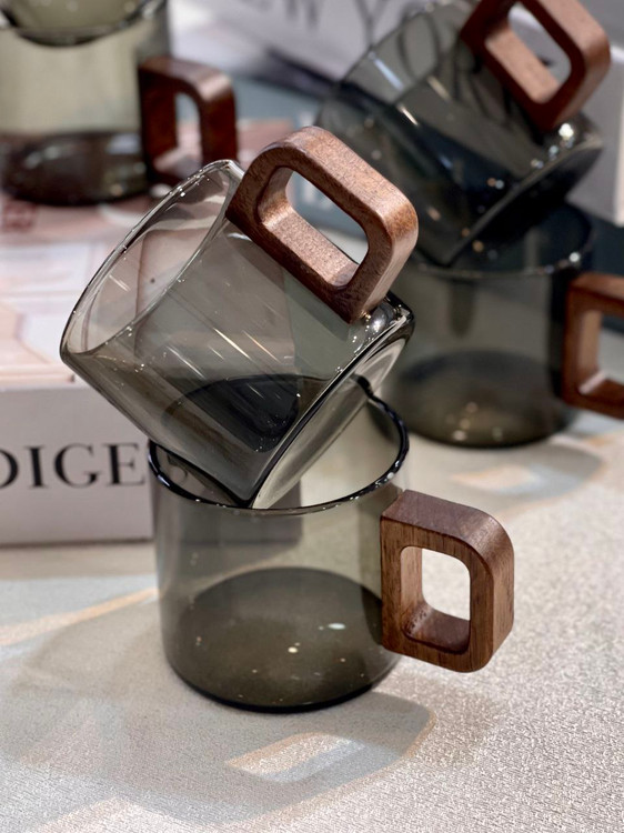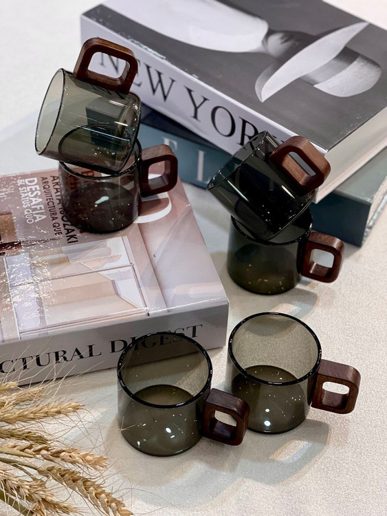 فنجون کوتاه مربعی ۶ تایی دسته چوبی دودی