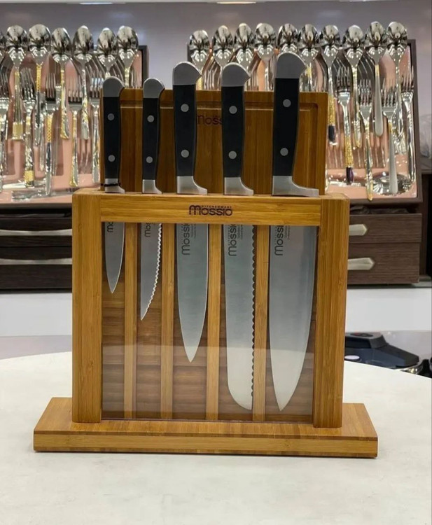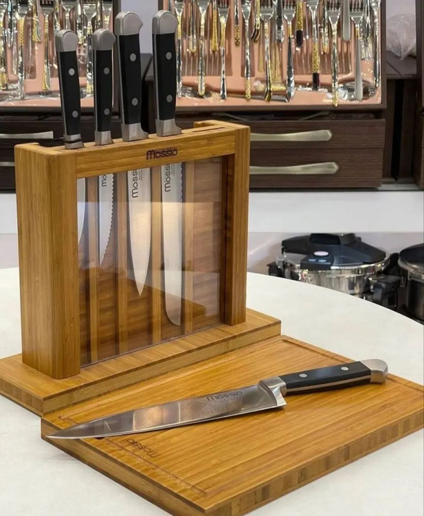 محصول ژاپن تعداد پارچه۷پارچه ضریب تیزی دوازده تیغه والادیوم بسیارمقاوم وتیز جنس جا کاردی پایه بامبو دارای ضمانت۲ساله تعداد: ۲عدد کارد دم دستی ۲عدد کارد گوشت کارد نون بری تخته گوشت
