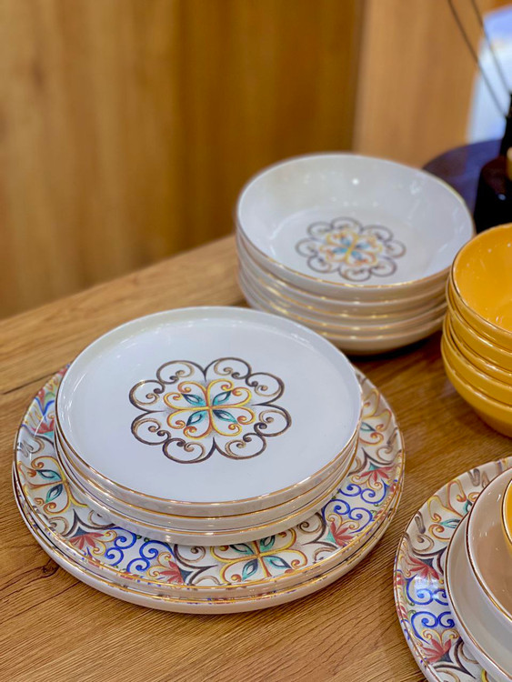 سرویس غذا خوری و عصرانه خوری Soho محصول acar ترکیه🇹🇷🇹🇷🇹🇷 جنس:سرامیک فشرده دکور شده با طلای ناب🏅 لعاب روی بدنه فوقالعاده شفاف و براق قابل استفاده در ماشین ظرفشویی و ماکروفر اقلام شامل: سرویس غذا خوری 6 نفره 27 پارچه👇 6 عدد بشقاب پلو خوری سایز 26 6 عدد بشقاب خورشت خوری سایز 19 6 عدد پیش دستی سایز 20 6 عدد پیاله سایز 14.5 2 عدد دیس سایز 11*22 1 عدد کاسه بیضی سایز 15*29 فقط۵/۳۰۰