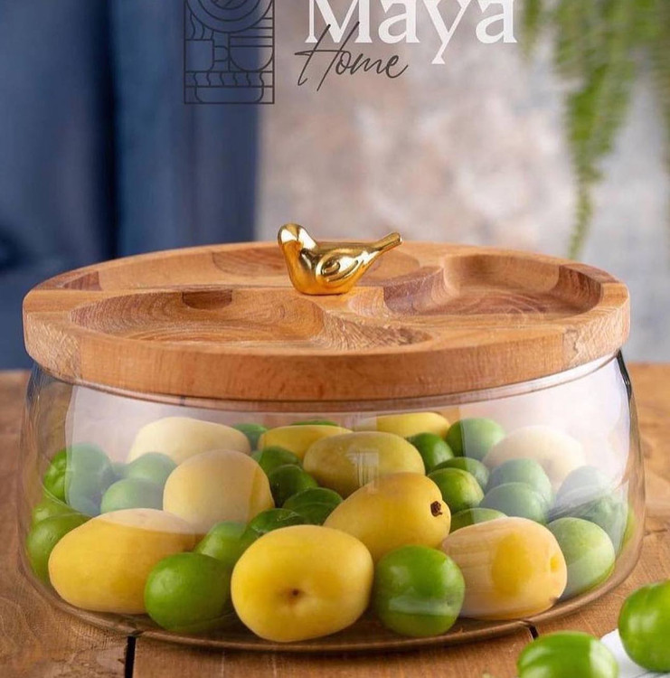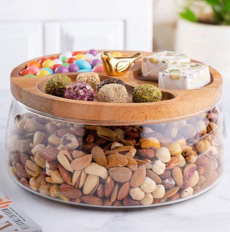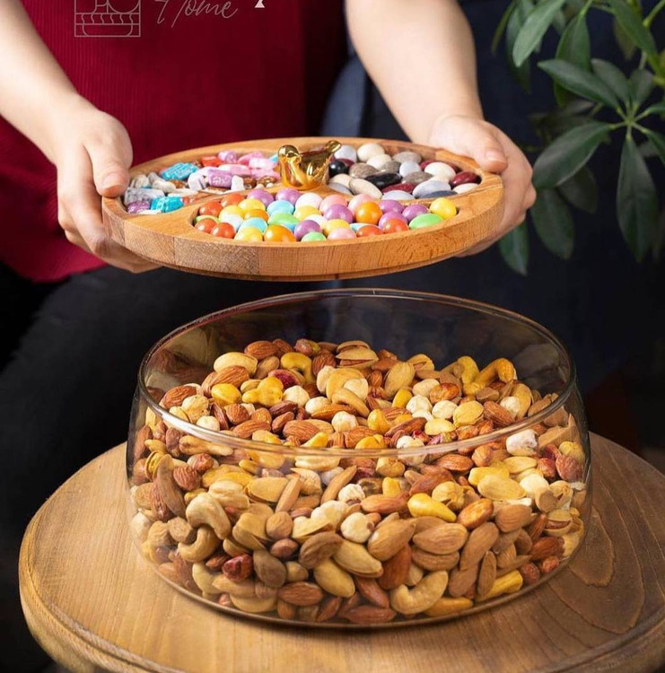 ظرف سرو درب چوبي( اجيل خوري) تركيبي از شيشه و چوب راش قطر ٢٢ و ارتفاع ١١ سانت فقط۵۹۰