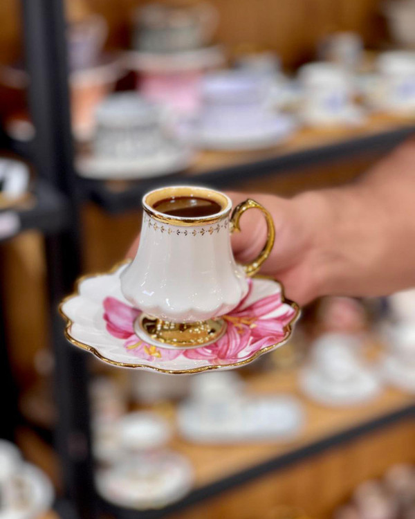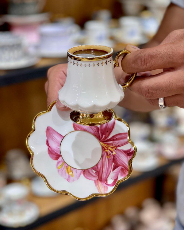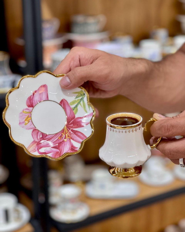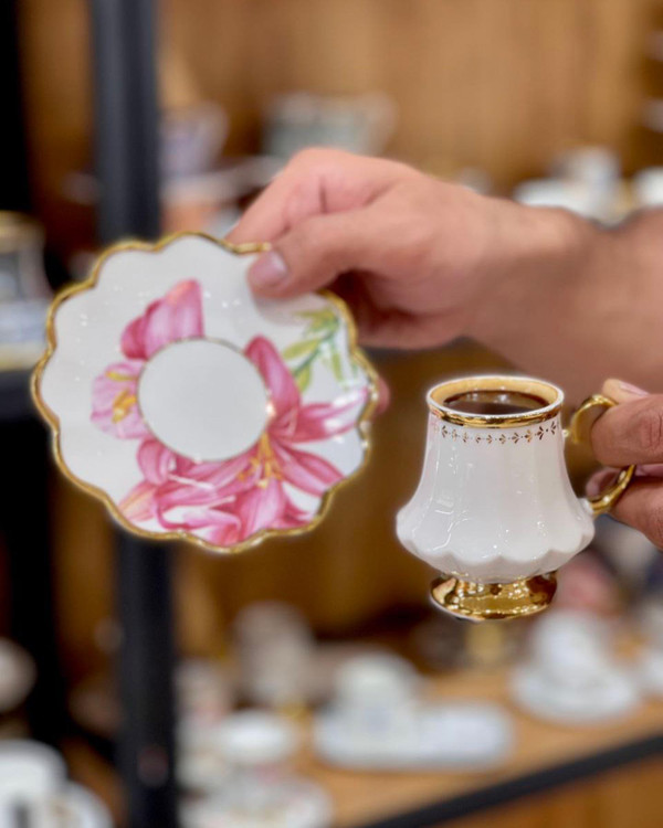ست فنجان و نعلبکی lilyum çiçeği محصول acar ترکیه جنس:چینی بونچاینا دکور شده با طلای ناب بسته بندی گیفت باکس ست شش نفره: